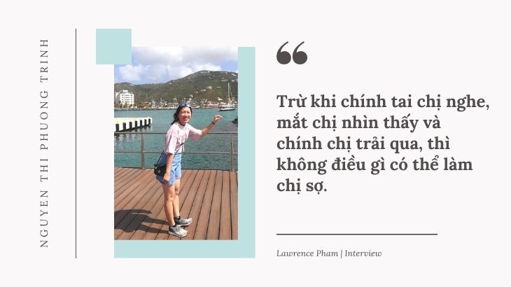 Thật ra chị không biết lý do vì sao. Có thể là do khát khao đi ra thế giới của chị đã ấp ủ từ rất lâu. Từ những năm cấp ba, chị đã thích đi đến nhiều nơi. Bây giờ chị muốn bung ra khỏi chiếc hộp đã giam giữ chị. Chị thấy người khác làm được, đi được, thì tại sao chị lại không được như thế. Chị cũng biết tiếng Anh, năng lực chị không đến nỗi, nên chắc chắn chị sẽ làm được.