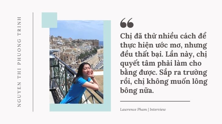 Vì đã thử những cách trước mà không thành công, chị nói với bản thân mình: “Lần này nhất định phải làm được”. Những lần trước càng thất bại bao nhiêu, chị càng tức giận bấy nhiêu và buộc lòng mình lần này phải làm được. Giống như là sống chết cũng phải làm. Sắp ra trường rồi, chị không muốn lông bông nữa.