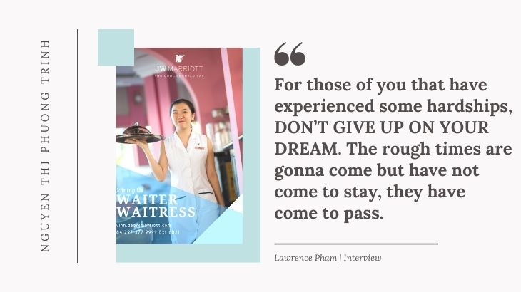 Từ nhỏ đến lớn chị quen sống sung sướng rồi. Những công việc làm thêm thời sinh viên cũng loanh quanh như trợ giảng, nhân viên văn phòng, thiên về giao tiếp chứ không phải lao động chân tay. Làm việc ở resort Phú Quốc, chị bắt đầu từ những công việc nhỏ nhặt nhất, mà lại khó khăn nhất. Chị bị sốc toàn tập. Hôm nào cũng đi và chạy từ sáng đến chiều, trầy chân và chảy máu là chuyện bình thường; mang vác, bưng bê những chiếc khay to bằng cái bàn, trên đó là hàng chồng chén dĩa sứ và hàng trăm chiếc muỗng nĩa dao bạc. Ngày đầu mới đi làm 3 tiếng là chị muốn xách vali về nhà luôn.