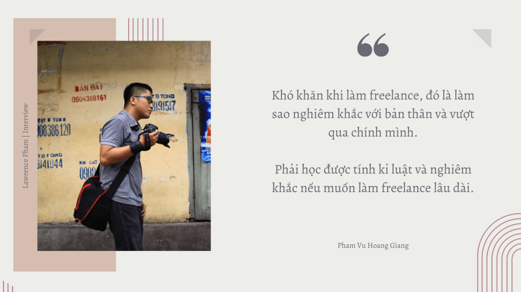 Mỗi một công ty hay tổ chức đều có những quy tắc riêng để đảm bảo bộ máy hoạt động trơn tru, hiệu quả. Khi mình đi làm cho họ, mình cần tôn trọng và làm theo những quy tắc đó. Còn khi làm freelance, mình phải tự đặt ra quy tắc cho bản thân. Điều khó khăn nhất, theo anh đó là làm sao vượt qua chính bản thân mình. Có những lúc anh lười lắm. Đã vài lần anh không làm được, anh không vượt qua chính anh được.