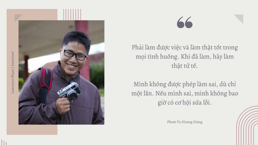 Với niềm đam mê kể lại những câu chuyện của người khác và ghi lại những khoảnh khắc cuộc sống của mọi người xung quanh, anh chọn lựa một con đường không phải ai cũng lựa chọn trải qua. Tuy nhiên, bằng tất cả sự yêu thích, nỗ lực của bản thân, anh vẫn từng bước tiến xa hơn nữa. Và tôi tin anh sẽ còn đi xa hơn thế, bởi những đức tính đáng quý, đáng yêu, cùng với những trải nghiệm anh chưa bao giờ ngại ngần chia sẻ cùng mọi người.