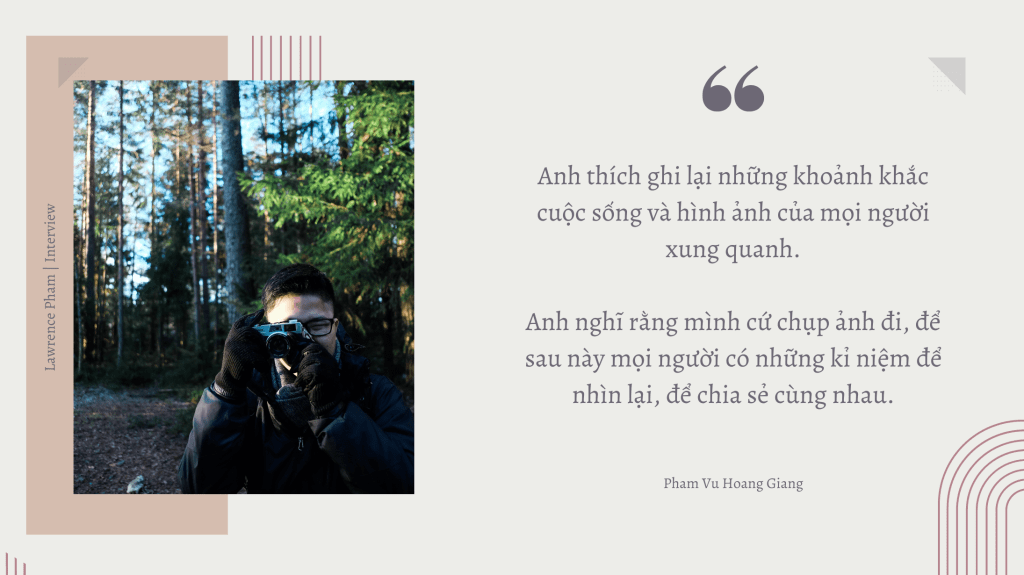 Với niềm đam mê ghi lại những khoảnh khắc cuộc sống và chia sẻ chúng với mọi người xung quanh, anh đã chọn công việc Freelance Photojournalist. Dù trải qua nhiều khó khăn, anh vẫn đang đi trên con đường ấy. Anh hiểu được chính mình – đó cũng là điều quan trọng nhất mà anh nghĩ mỗi người cần có được.